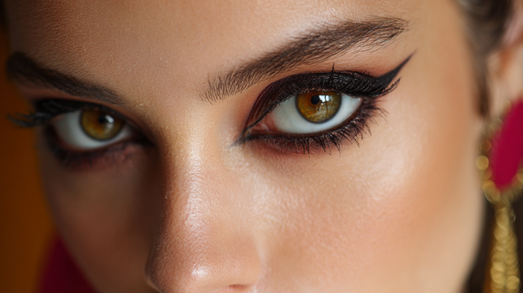 • Eyeliner: Create a sharp, upward flick at the outer corner of the upper lash line.
